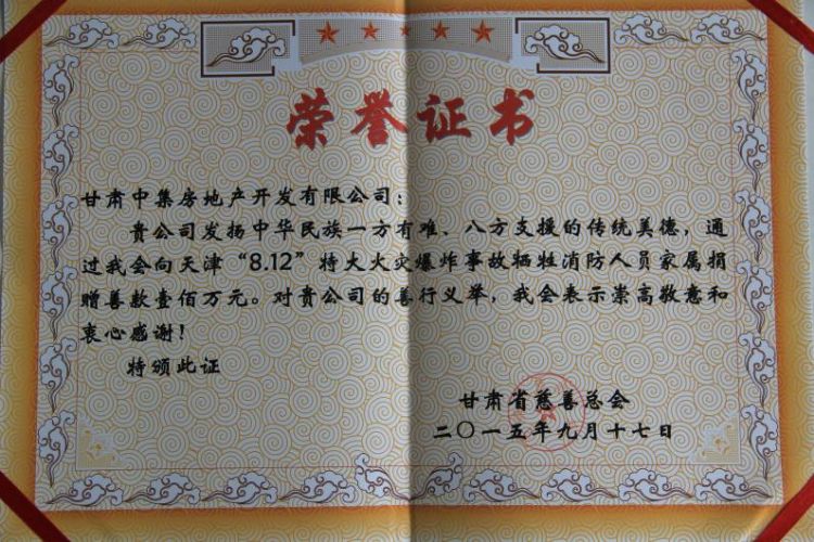 2015年8月12日23時30分,天津濱海新區(qū)國際物流中心發(fā)生重大爆炸火災(zāi)事故,造成重大人員傷亡。甘肅中集房地產(chǎn)開發(fā)有限公司總經(jīng)理周啟濤獲悉后,決定為在本次事故中犧牲的消防官兵及其家屬捐款100萬元,用于幫助犧牲消防官兵家屬善后事宜的處理,以盡一份甘肅企業(yè)的慈善愛心。