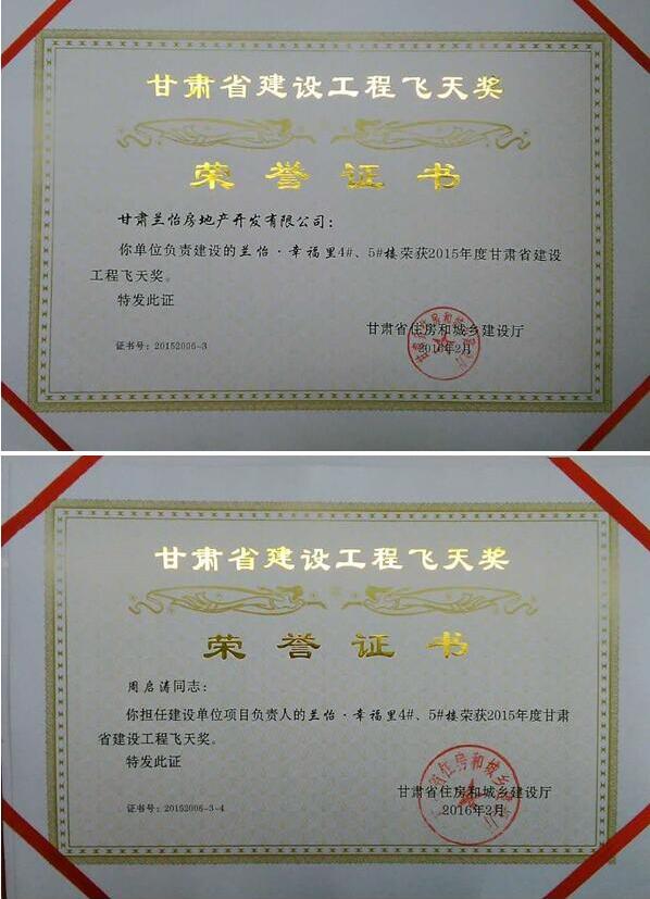 2016年2月5日,由甘肅省住房和城鄉(xiāng)建設(shè)廳評選的2015年度甘肅省建設(shè)工程“飛天獎”對社會各界發(fā)布,本次共發(fā)布41個“飛天獎”項(xiàng)目。其中,由甘肅中集實(shí)業(yè)集團(tuán)子公司甘肅蘭怡房地產(chǎn)開發(fā)有限公司開發(fā)建設(shè)的中集·幸福里憑借高品質(zhì)的開發(fā)標(biāo)準(zhǔn),喜獲甘肅省2015年度建設(shè)工程“飛天獎”榮譽(yù)稱號,成為蘭州市安寧區(qū)唯一獲此殊榮的項(xiàng)目。